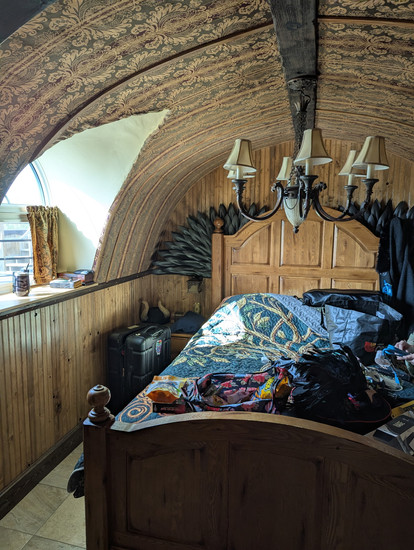 At last, we climbed the hill to the Burrow—our home for the quest. Within, we discovered a realm of cozy splendor. Every nook whispered of thoughtful artistry: trinkets, relics, and enchanted oddities adorned the walls. Though there was no soaking tub for weary bones, the shower was both elegant and accessible, and outside, a bubbling cauldron of warmth (hot tub!) beckoned under the stars.